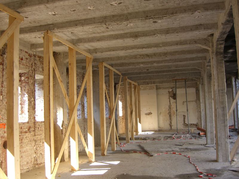 Die Balken der Rippendecke wurden mit parallel zur Fassade angeordneten Holzstützen abgefangen. Mit der hohen Tragfähigkeit von Holz in Faserrichtung konnte eine wirtschaftliche Lösung erzielt werden. Nach Herstellung der Stützkonstruktion für die Fassade konnte nun eine 1.00m breite Gasse hinter der Fassade geschaffen werden, um den abzubrechenden maroden Gebäudeteil zu trennen. Nach der Trennung konnte konventionell mit einem Bagger mit Longfront-Ausleger und Hydraulikzange abgebrochen werden.