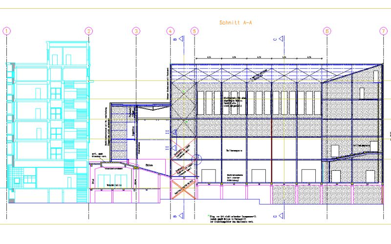 Aufgrund fehlender statischer Altunterlagen musste die Tragwerksstruktur des Musiksaals für die Festlegung der Abbruchreihenfolge vor Ort aufgenommen werden.