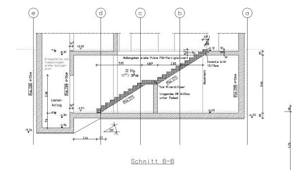 Im Kellergeschoß mußte bei der Ausführungsplanung insbesondere Rücksicht auf einen vorhandenen, zu überbauenden Verbindungsgang genommen werden, dessen Lage nicht genau bekannt war. Bei der Flachgründung mußten die unterschiedlichen Gründungsebenen beachtet werden (Abtreppung).