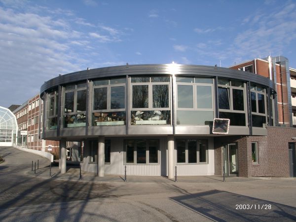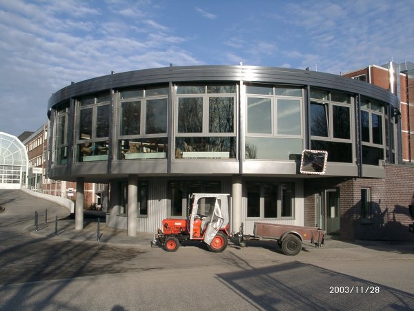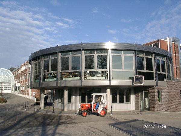 Die eigentliche Cafeteria befindet sich im raumhoch verglasten EG und ist hauptsächlich in Stahlbauweise geplant worden.