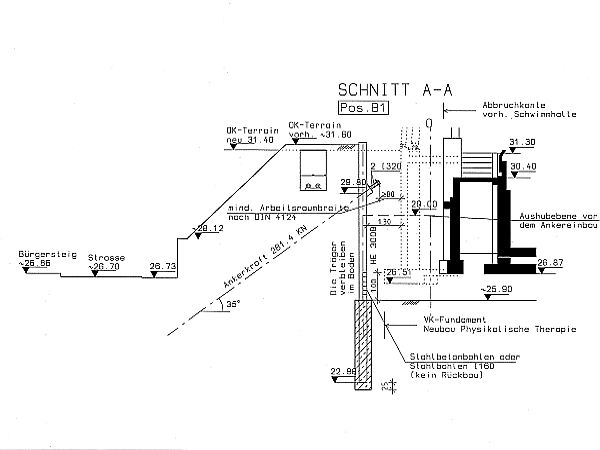 Der östliche Anschluß an die bestehende Bebauung war sehr aufwändig, weil unterhalb des vorhandenen Gebäudes das 2.UG einschließlich der Geschoßdecke neu hergestellt werden mußte (Unterkellerung).
