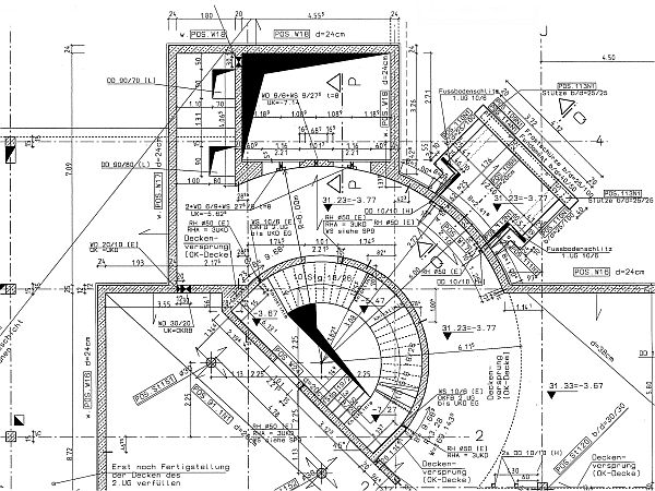 Das machte es erforderlich, die beiden darüber befindlichen Geschosse durch Hilfsabstützungen großflächig abzufangen, ohne daß diese provisorischen Abfangemaßnahmen die eigentliche Bautätigkeit zu sehr behindern durften.