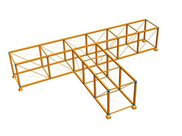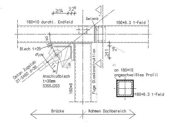 Im Dachbereich auf der Südseite wird die Brücke als Gang (Zweigelenkrahmen) auf der vorhandenen Dachdecke weitergeführt.