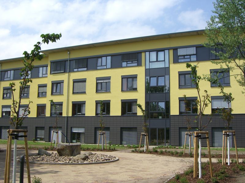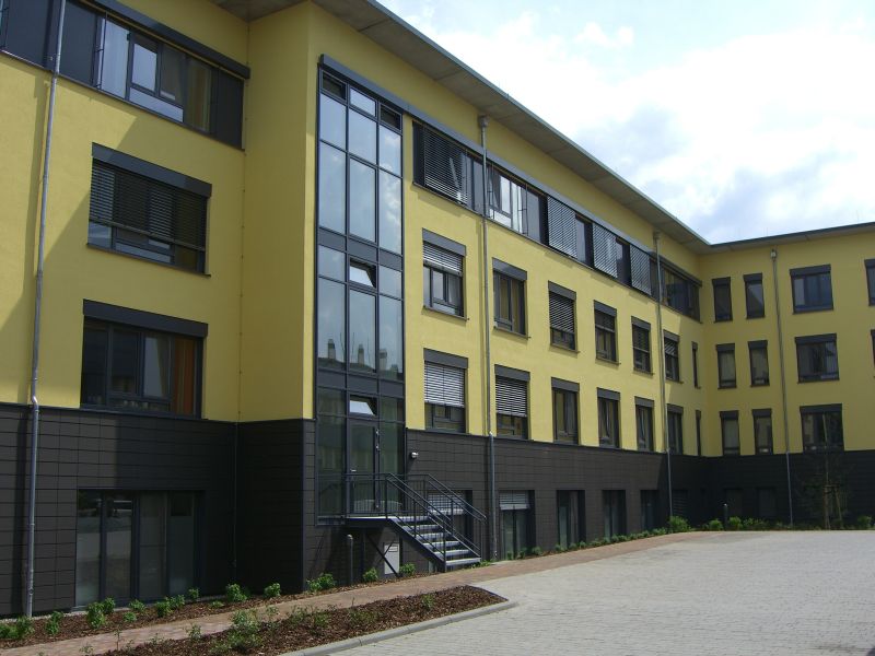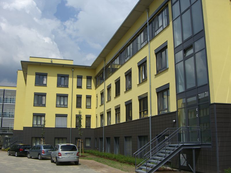 Die Geschoßdecken sind im wesentlichen als Flachdecken ausgeführt. Das unregelmäßige Stützenraster wurde in Zusammenarbeit mit dem Architekten unter Berücksichtigung der erforderlichen Raumaufteilung und den Stützweitenverhältnissen der Decke zur Materialeinsparung bei der Vorplanung optimiert. Aufgrund der großen Gebäudelänge erfolgte eine Fugentrennung der beiden Seitenflügel vom Mittelteil. Durch den Einbau von Querkraftdornen in den Sohlen und den Decken wurden ungleiche Setzungen im Übergangsbereich vermieden. Die Kellerwände und die Kellersohle wurden als Weisse Wanne ausgeführt.