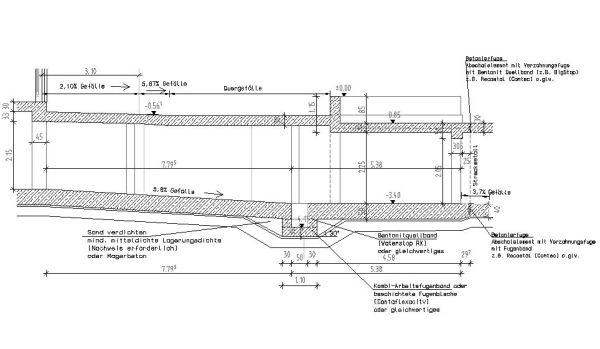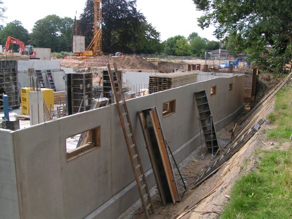 Die Gründung erfolgte auf einer Stahlbetonsohlplatte, die zur Abdichtung gegen Bodenfeuchte als Weisse Wanne ausgebildet wurde. Um die Sohle möglichst hoch anordnen zu können, haben wir die erdüberdeckte Tiefgaragendecke als unterzugsfreie Flachdecke geplant.